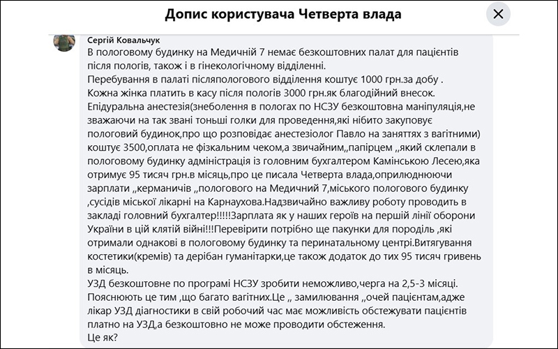 Сергій Ковальчук під фейсбук-публікацією «Четвертої влади» про благодійні внески поскаржився, що заплатив після пологів дружини три тисячі гривень та три з половиною тисячі за епідуральну анестезію. «Оплата не фіскальним чеком, а звичайним папірцем», – додав чоловік.