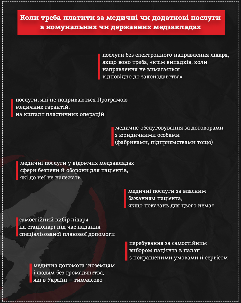 Окрім того, як виходить з пояснення юристів зі «Своїх людей», медзаклад, надаючи пацієнтам платні послуги, в рази додає собі клопотів: треба дотримуватися визначеного переліку, оплати приймати безготівково, оформлювати відповідні бухгалтерські документи, сплачувати податок на прибуток і в певних випадках – ПДВ.