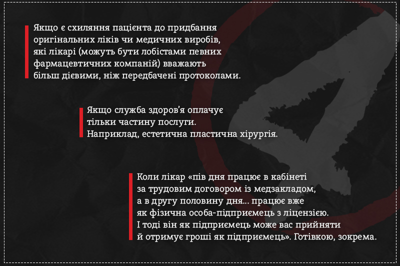 Пацієнтка погоджується, бо їй треба знати про своє здоров’я вже і зараз. І приблизно впродовж години отримує потрібне – за псевдоблагодійний внесок. Водночас у закладу лишається можливість провести її обстеження через Програму медичних гарантій і таким чином двічі отримати кошти: від НСЗУ перерахунком і від пацієнтки готівкою.