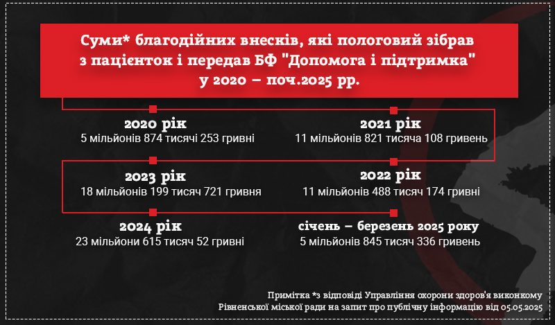 Водночас благодійна допомога не оподатковується. Скільки грошей заробив пологовий у 2020-2024-му роках в якості «благодійних внесків»? У відповіді на наш запит відповіли, що пацієнтки–«благодійниці» пожертвували для БФ «Допомога і підтримка» за ці роки майже 71 мільйон гривень. Лише за 2024-й сума благодійних внесків становила 23 мільйони 615 тисяч гривень. За три місяці 2025-го – 5 мільйонів 845 тисяч гривень.