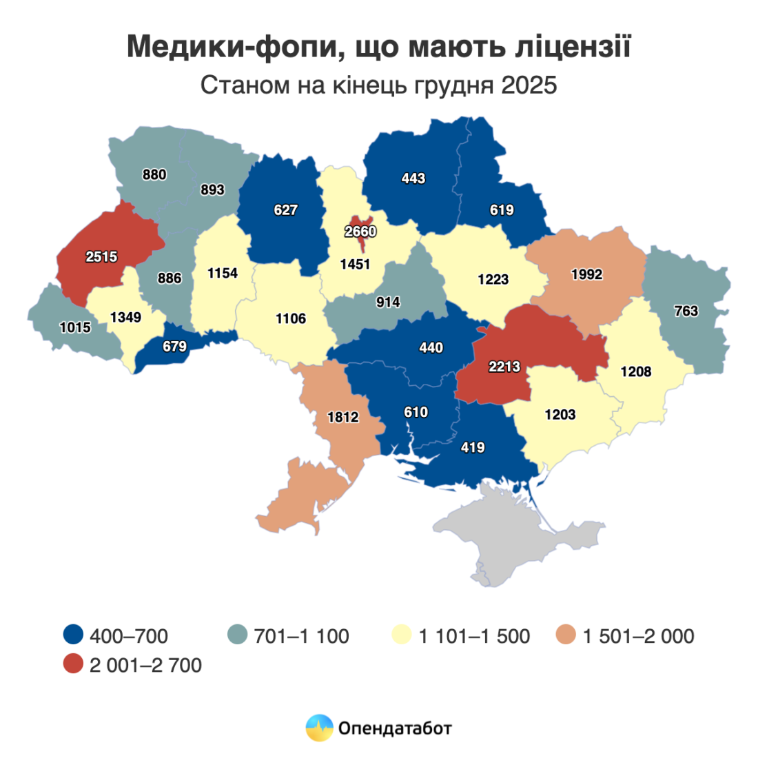 Як йдеться в аналітиці Опендатабот, 67% фахівців ліцензій видали лікарям та медичним фахівцям, які працюють самостійно (29 тисяч 614 осіб).